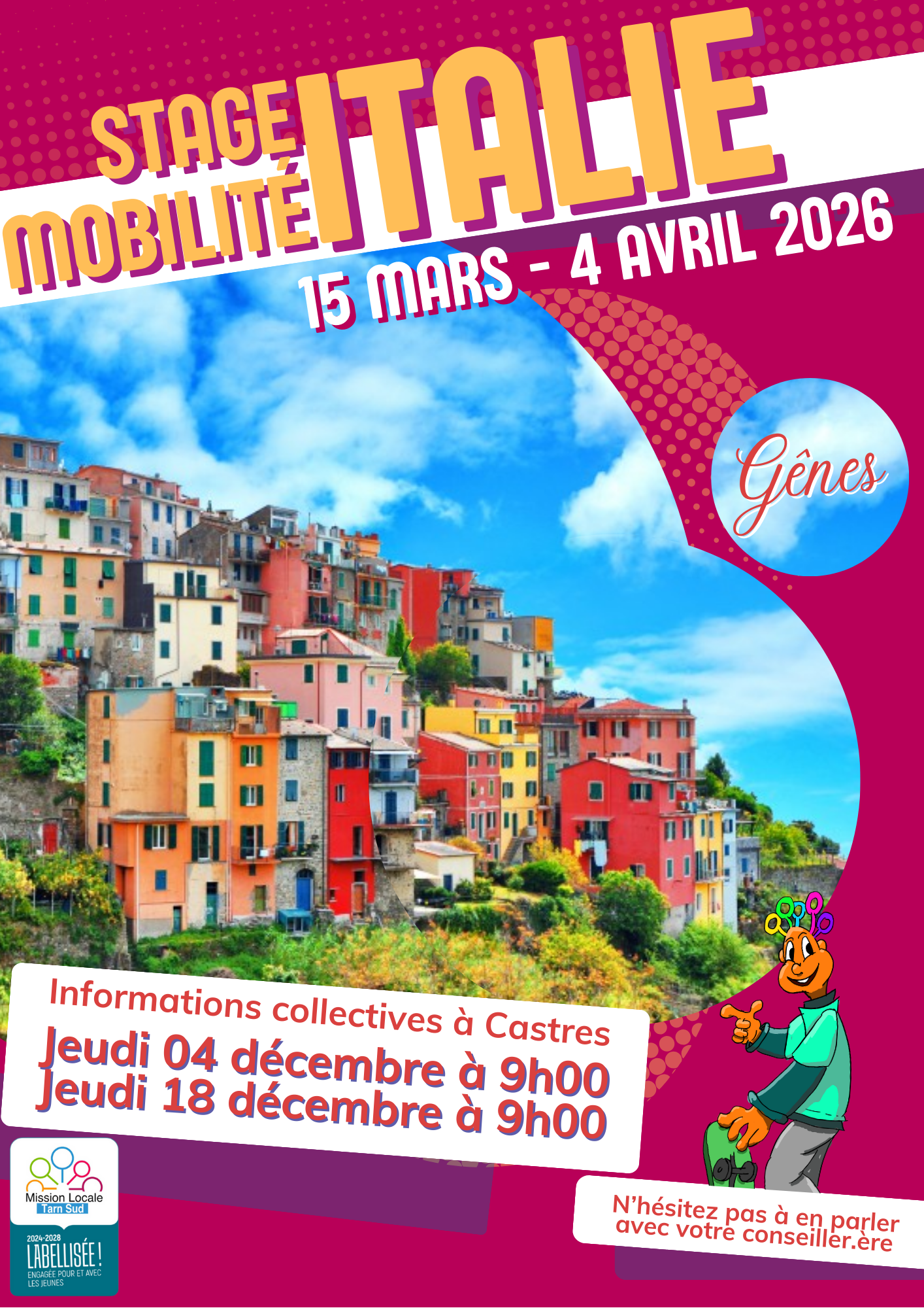 Les Informations collectives pour ce stage mobilité en Italie, auront lieu le jeudi 04 décembre et le Jeudi 18 décembre à 9h00 à Castres.